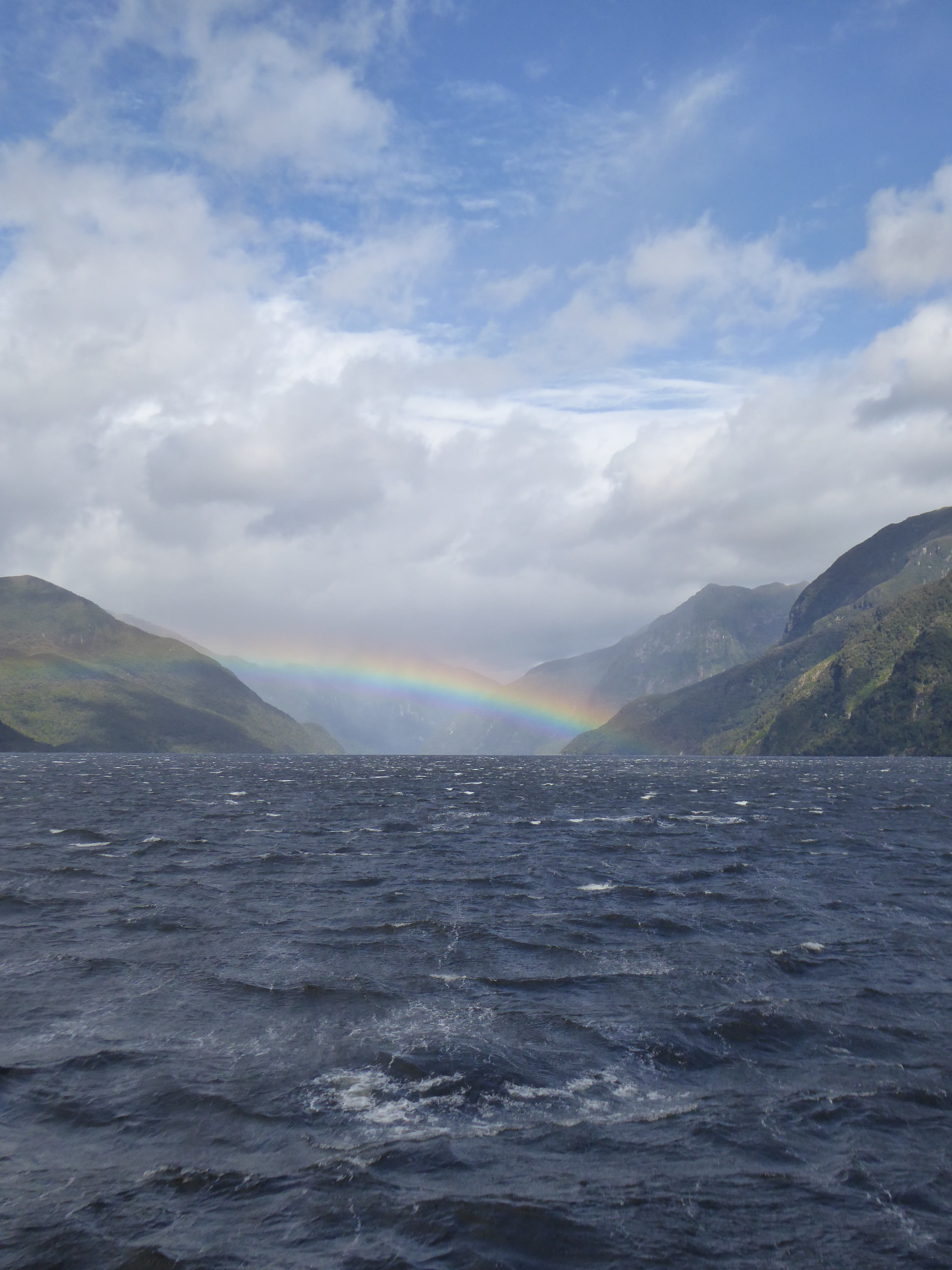 The cruise was lovely, but with 70 people it seemed so busy. We did talk a bit to an American couple who were nice but mostly it was on deck enjoying the scenery. The tour normally has kayak and small boat trips but it was too windy for these. It was sunny mostly with a few showers. Doubtful Sound gets over 7m of rain a year and got 11 last year. Wet. We sailed up the sound and were very lucky to see dolphins, an albatross, an amazing rainbow, some seals (at a distance) and experience windy gusting to 100kms per hour.